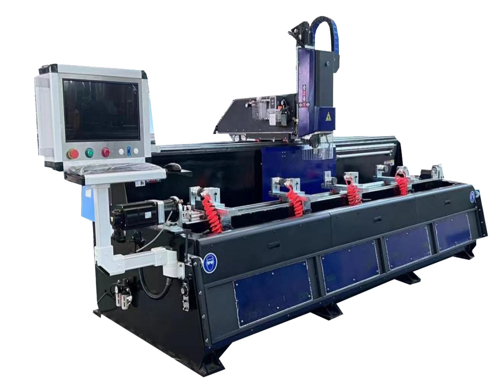 Обробний центр A9-2000-3+1 являє собою універсальний свердлильно-фрезерний верстат з ЧПУ, призначений для промислової обробки дверного та віконного алюмінієвого профілю, алюмінієвого профілю з круглим отвором для вентильованих фасадів, прорізи замкових отворів, ходових та інших отворів та фрезерування, зняття фасок, плоского гравіювання, може різати будь-які кути від 0 до 180°, підвищуючи ефективність обробки.